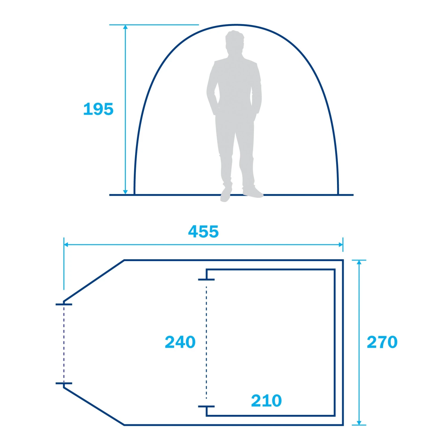 • Sleeps up to 4 people • Ideal for families and for camping with friends • Includes windows with blinds to let in natural light • Material: 68D polyester (waterproof) • UV resistant • Hydrostatic head: 4000mm • Supplied with air pump with pressure release valve, pegs, guy lines & handy storage bag • Full Size: 455 x 270 x 195cm • Inner tent: 210 x 240 x 195cm